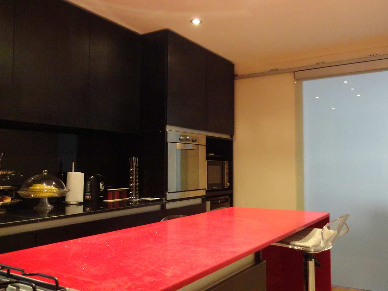 La cocina se agrandó y se armó con una isla, que contrasta dado su color rojo con los muebles de cocina y el mármol en color negro.